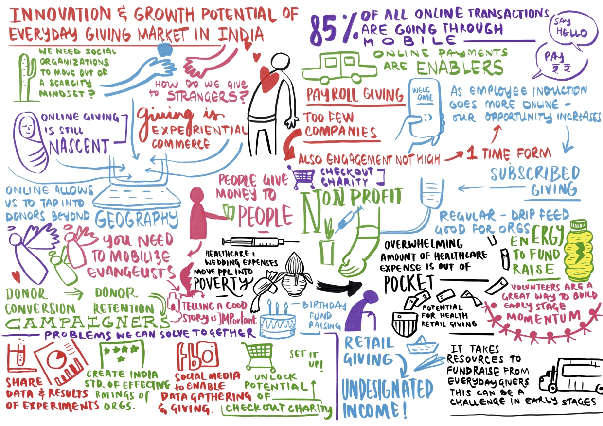 Key takeaways from the panel on “Innovation and growth potential of the formal everyday giving market in India” were illustrated in a live doodle by Ladyfingers Co.